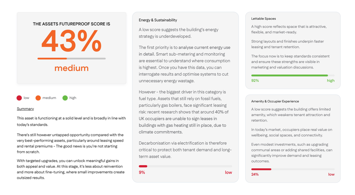 Designed with small family office and private commercial landlords in mind, this assessment equips users with a clear, data-driven benchmark of asset performance, highlighting how individual buildings measure up against both current market requirements and evolving occupier demand.